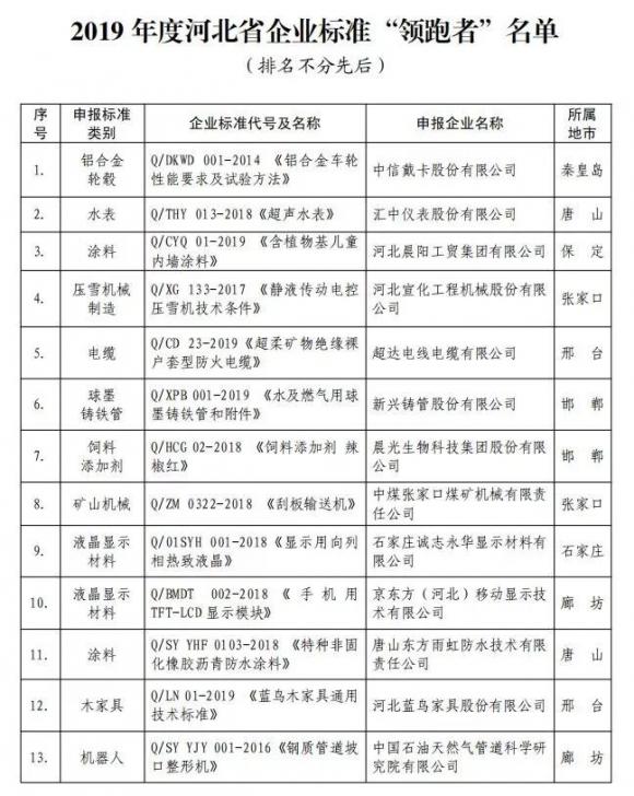 日前,河北省市場(chǎng)監(jiān)督管理局發(fā)布《2019年度河北省企業(yè)標(biāo)準(zhǔn)“領(lǐng)跑者”名單》,晨……