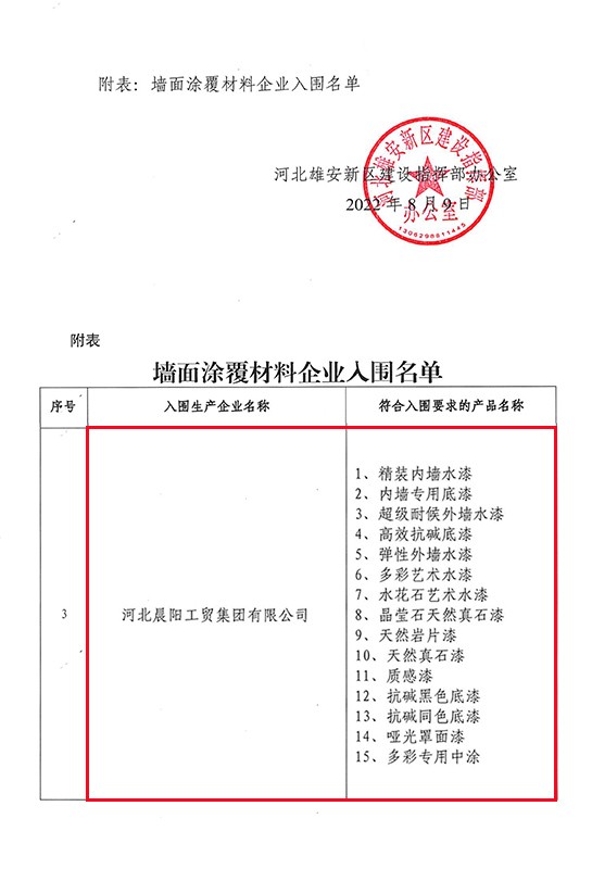 2022年8月9日,雄安新區(qū)建設指揮部辦公室發(fā)布了《關于發(fā)布增補入圍集采目錄墻面涂覆材料企業(yè)名單的通知》。據墻面涂覆材料企業(yè)入圍名單顯示:河北晨陽工貿集團有限公司(以下簡稱“晨陽水漆”)共計有15款內外墻環(huán)保水漆產品入選。